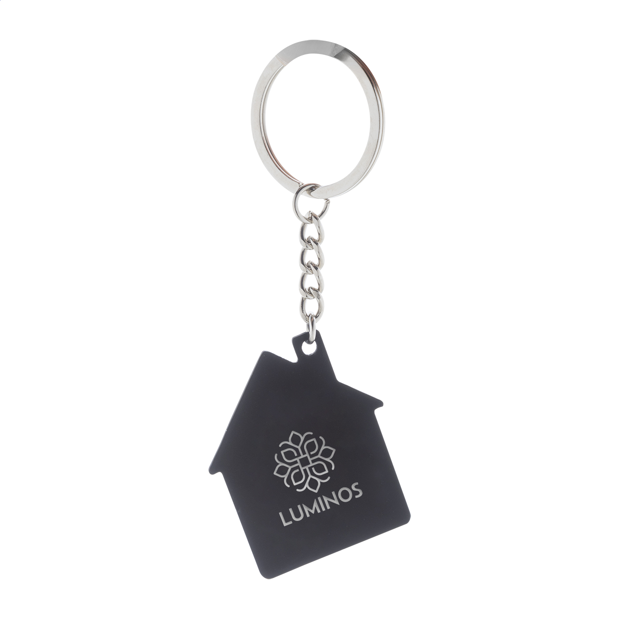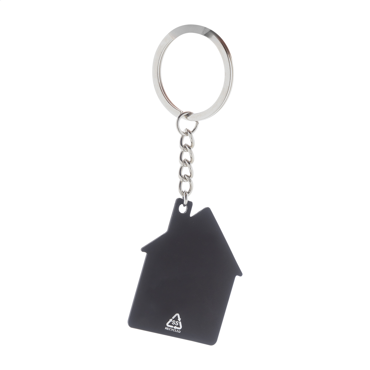 • Přívěšek na klíče z recyklované nerezové oceli ve tvaru domečku s pogumovaným povrchem. Se speciální vrstvou pro zrcadlové laserové gravírování.