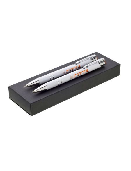 • sada kovová propiska a mikrotužka s bílým povrchem a barevným lesklým laserem v barvě horního ukončení propisky, tělo zdobené dvěma stříbrnými proužky, sada je nabízena v černé papírové krabičce PORE
