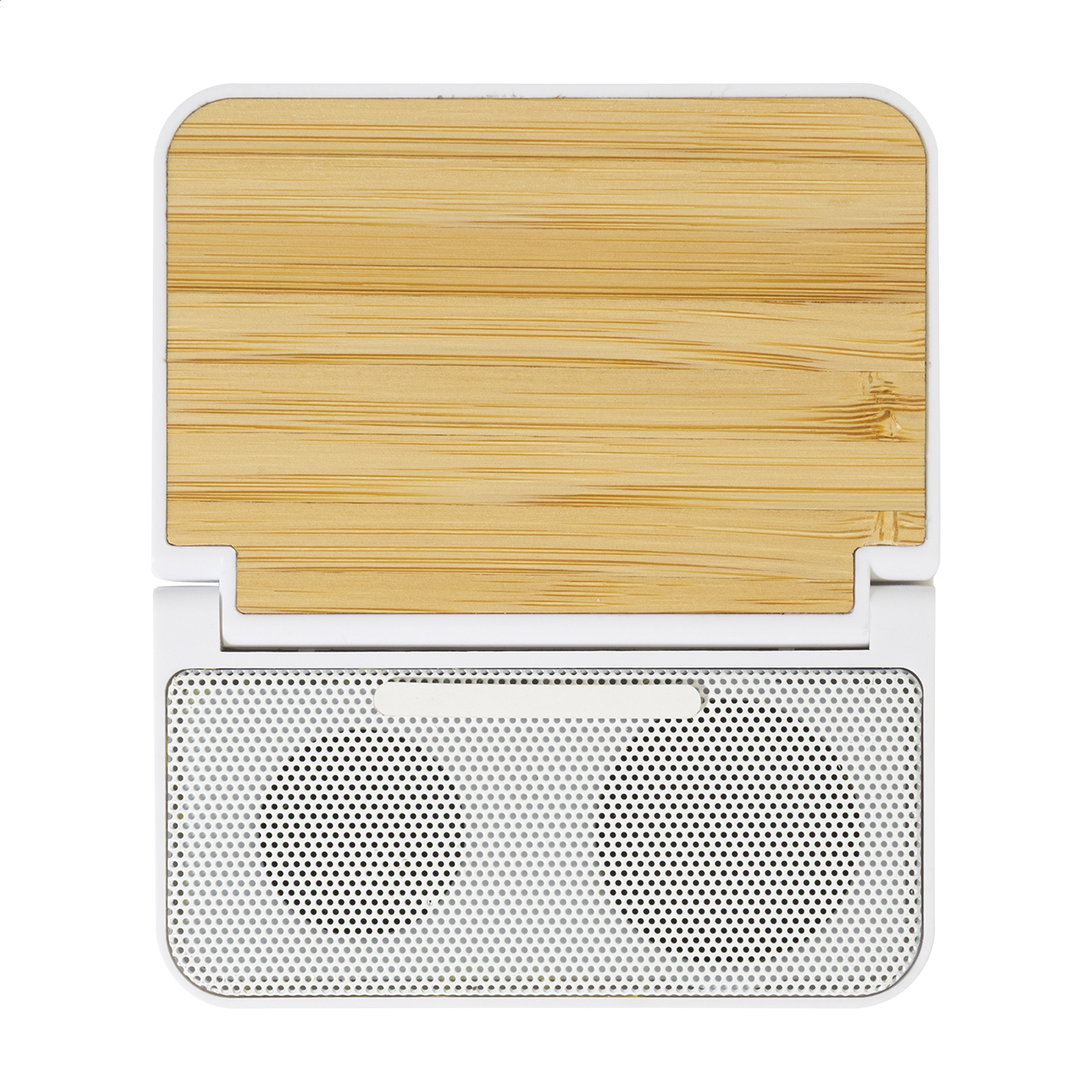 • Bezdrátový reproduktor z recyklovaného ABS plastu s držákem na mobil potaženým bambusem a vestavěnou bezdrátovou rychlonabíječkou (15 W). S vestavěnou dobíjecí baterií (1200 mAh). Včetně nabíjecího kabelu USB.