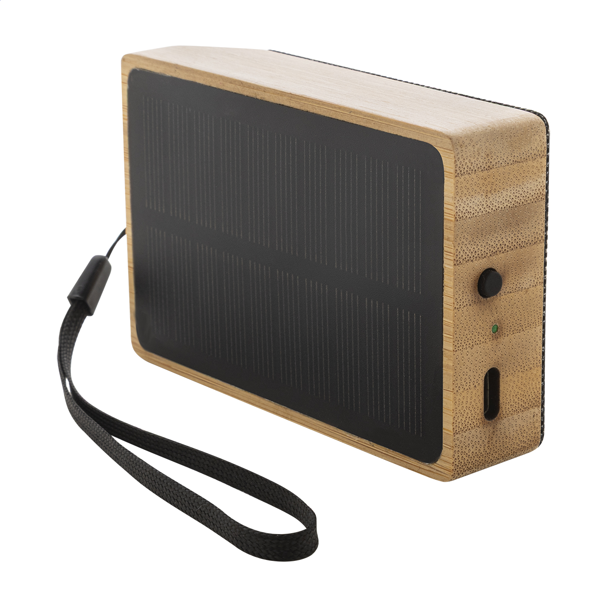 • Bezdrátový reproduktor z bambusu s polyesterovou síťovinou RPET, vestavěnou solární nabíječkou, popruhem na nošení a dobíjecí baterií (300 mAh). Včetně nabíjecího kabelu USB..
