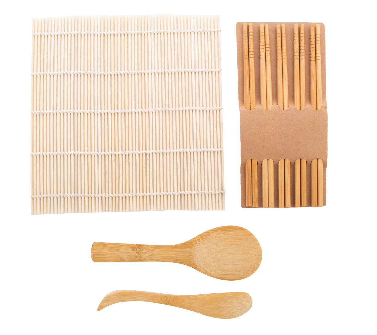 • Bambusová sada na přípravu sushi s bambusovou podložkou na sushi, bambusovým nožem a lžící na rýži a 5 páry hůlek. V kraftové papírové krabici.