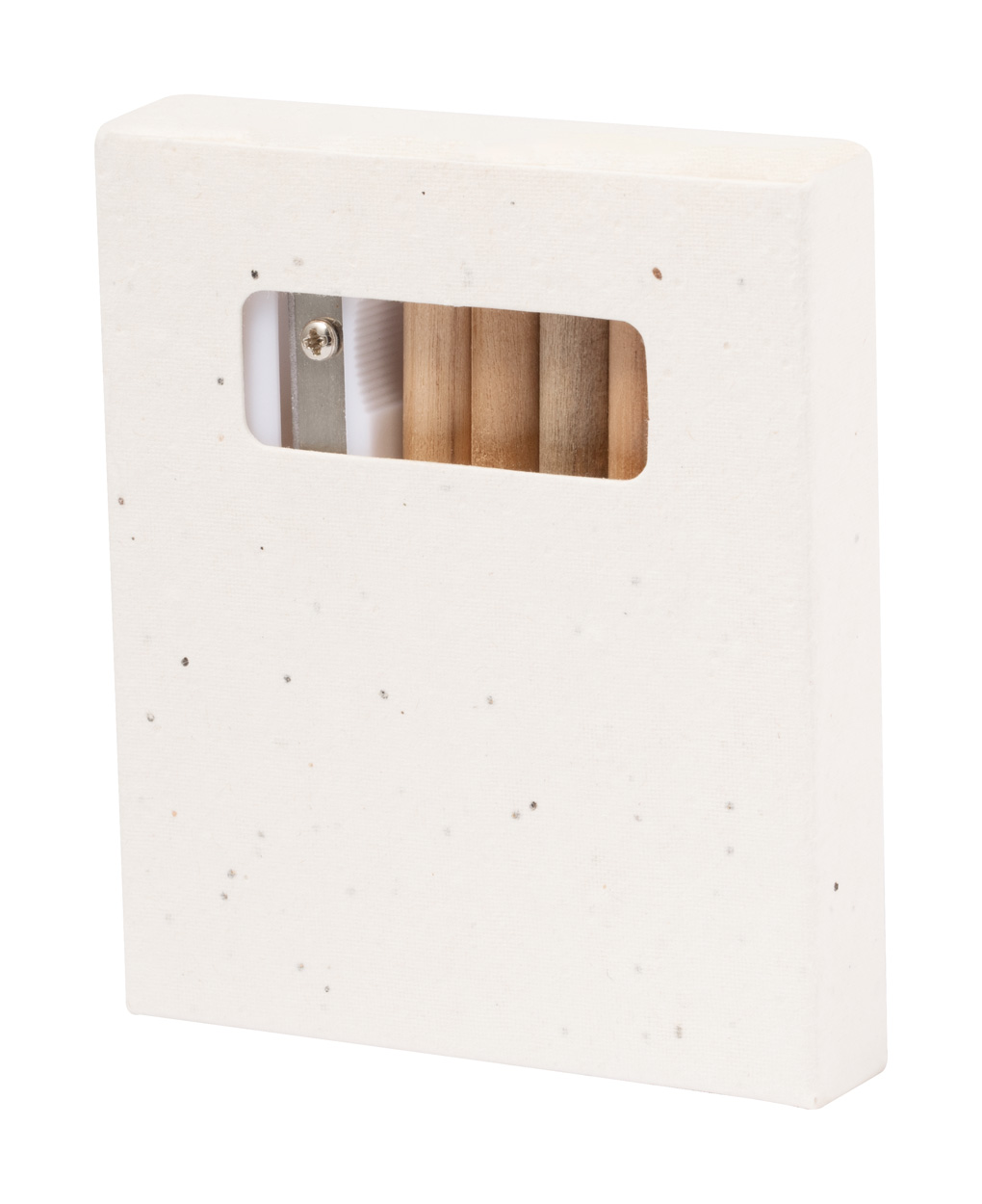 • sada na vybarvení v papírové krabičce se semeny, včetně 6 dřevěných pastelek, ořezávátka a 20 listů omalovánek