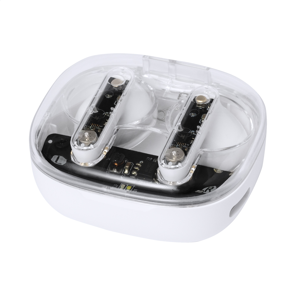 • Poloprůhledná, skutečně bezdrátová stereofonní sluchátka (TWS) s viditelnými elektronickými součástmi a funkcí hands-free volání. V poloprůhledném plastovém pouzdře s nabíječkou. Včetně nabíjecího kabelu USB.