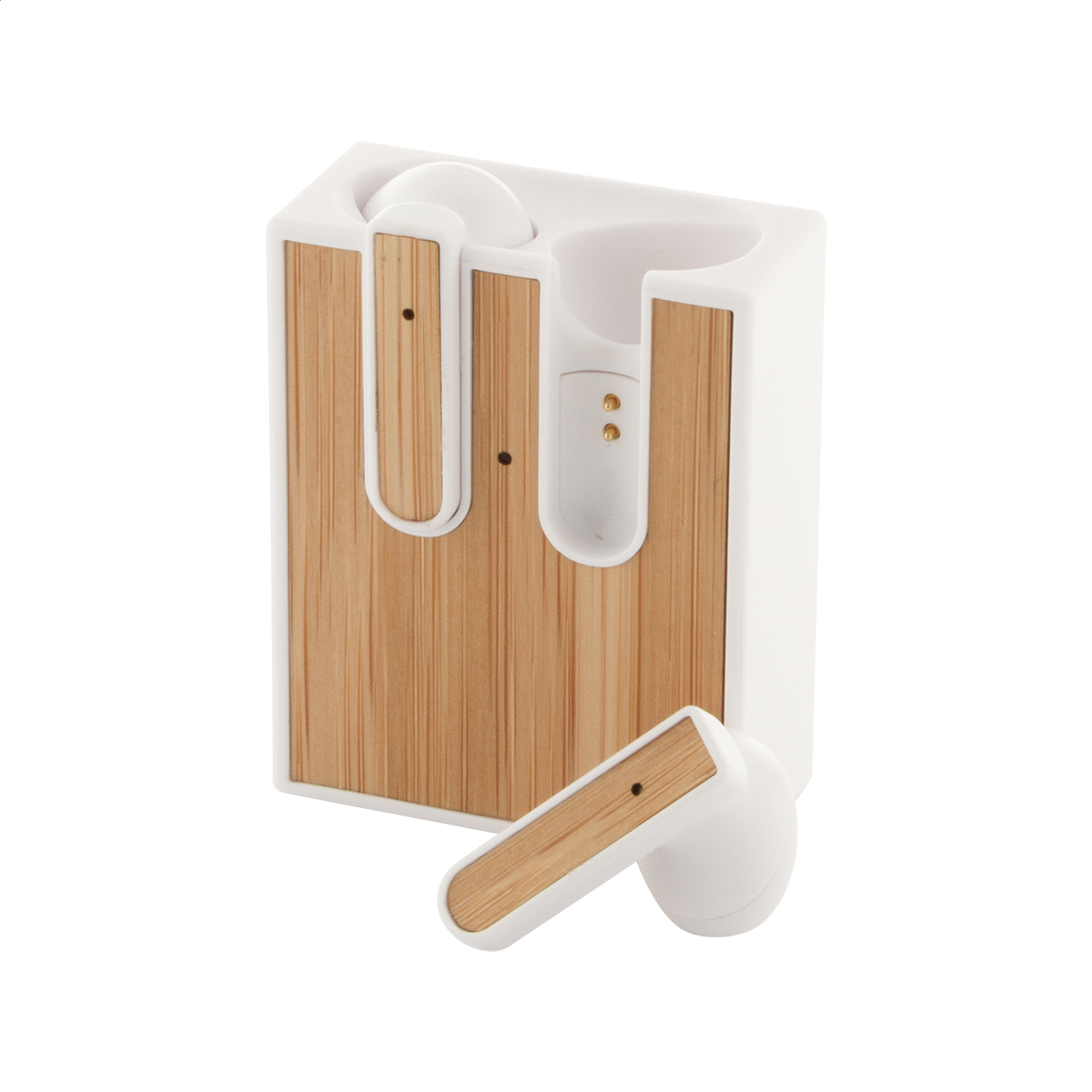 • Skutečně bezdrátová stereofonní sluchátka (TWS) s bambusovou vložkou a funkcí hands-free volání. V nabíjecím pouzdře z recyklovaného ABS plastu s bambusovou vložkou. Včetně nabíjecího kabelu USB.