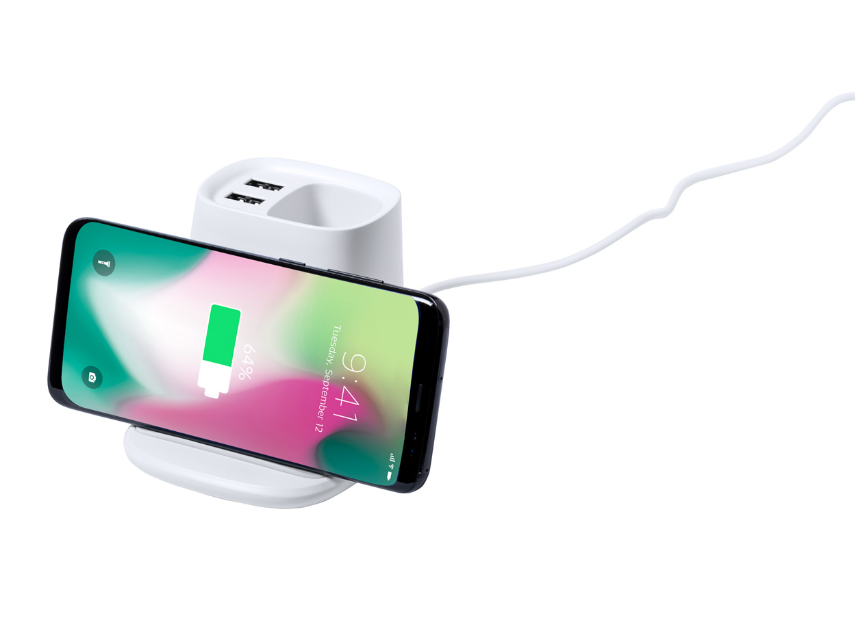 • multifunkční plastový stojánek na pera s držákem na telefon, vestavěnou bezdrátovou rychlonabíječkou (10W) a 2 porty USB nabíječky (max. výstup 2000 mA), včetně USB nabíjecího kabelu
