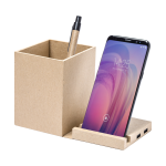 • multifunkční stojánek na pera z recyklované lepenky s držákem mobilního telefonu, bezdrátovou nabíječkou (max. Výkon 1000 mA) a 2portovým USB hubem (USB 2.0), včetně USB nabíjecího kabelu