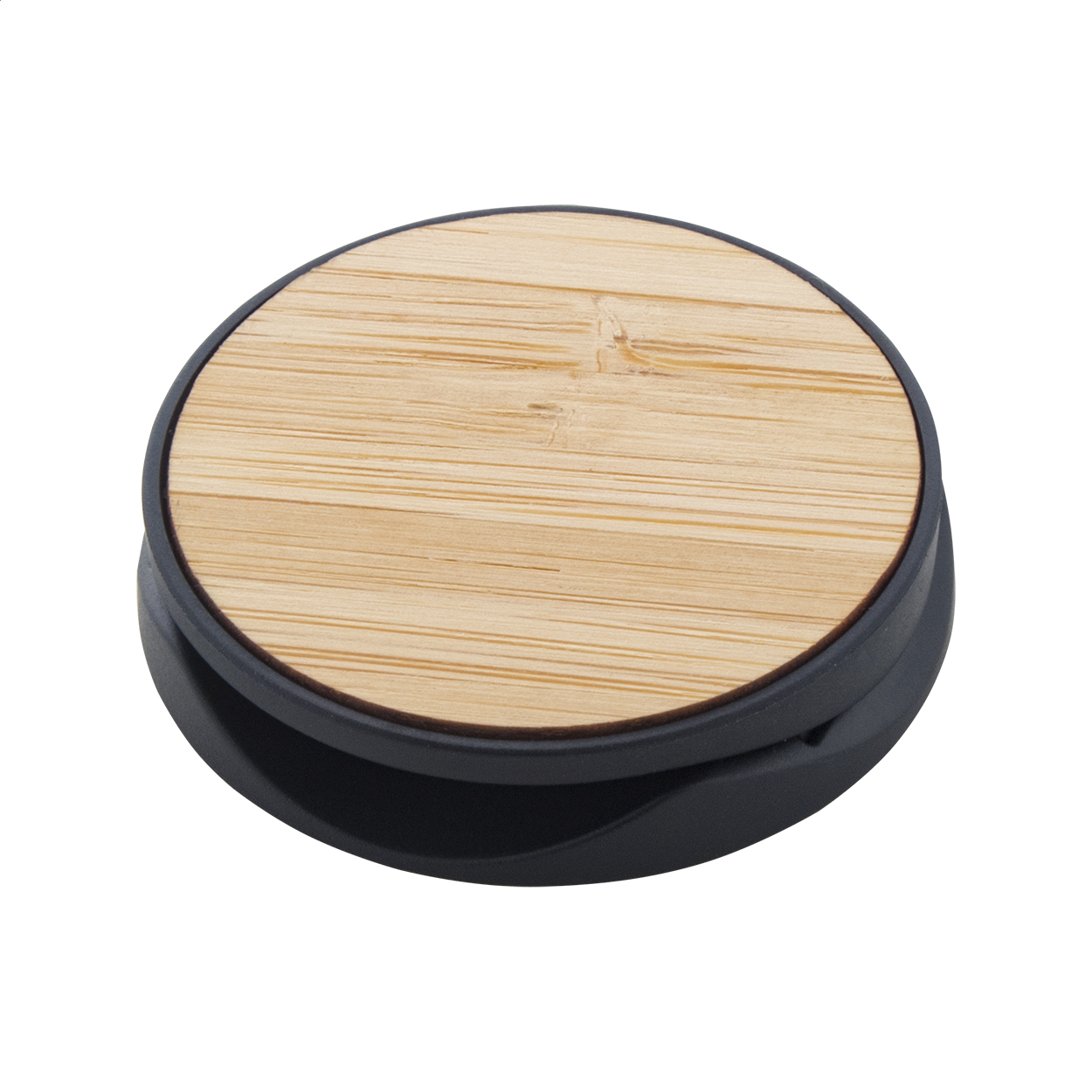 • Bambusem potažený, kulatý, plastový stojánek na mobil se samolepicí základnou.
