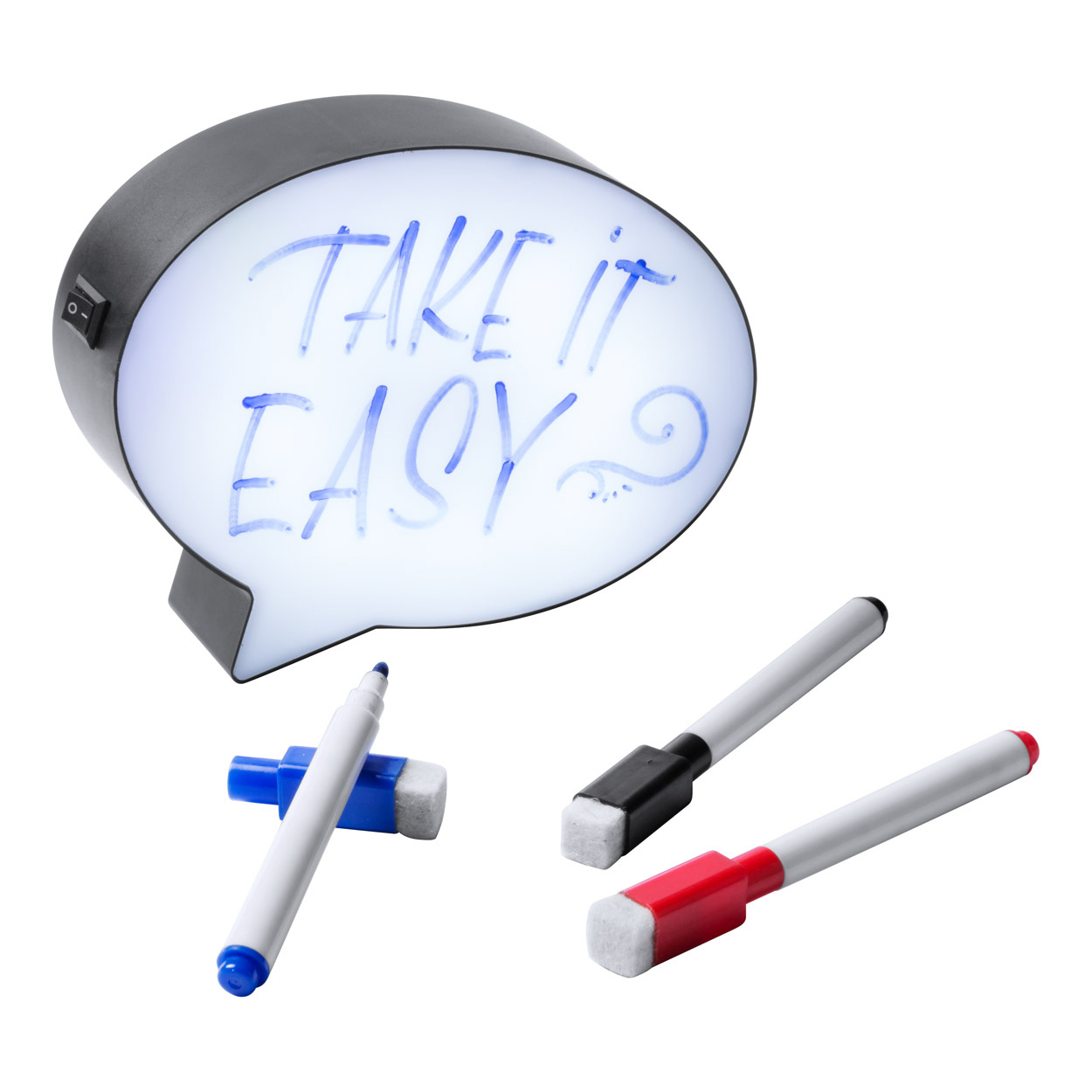 • tabulka na vzkazy s ikonou bubliny se 3 pery s plstí na vršku a gumou, tabulka se rozsvítí s 8 LED diodami, dodáváno bez 3 AAA baterií