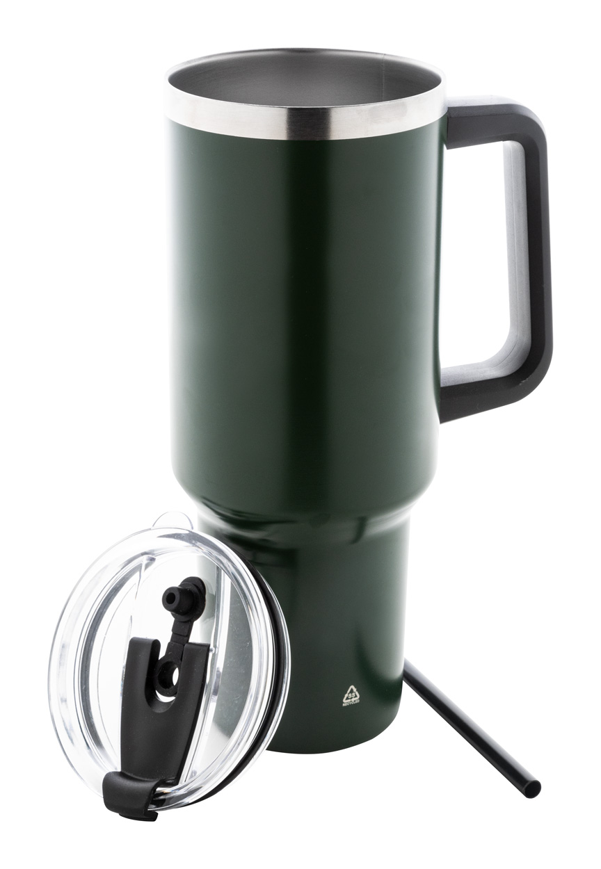 • Dvouplášťový vakuově izolovaný termo hrnek z recyklované nerezové oceli s PS víčkem na pití a PP brčkem 1200 ml