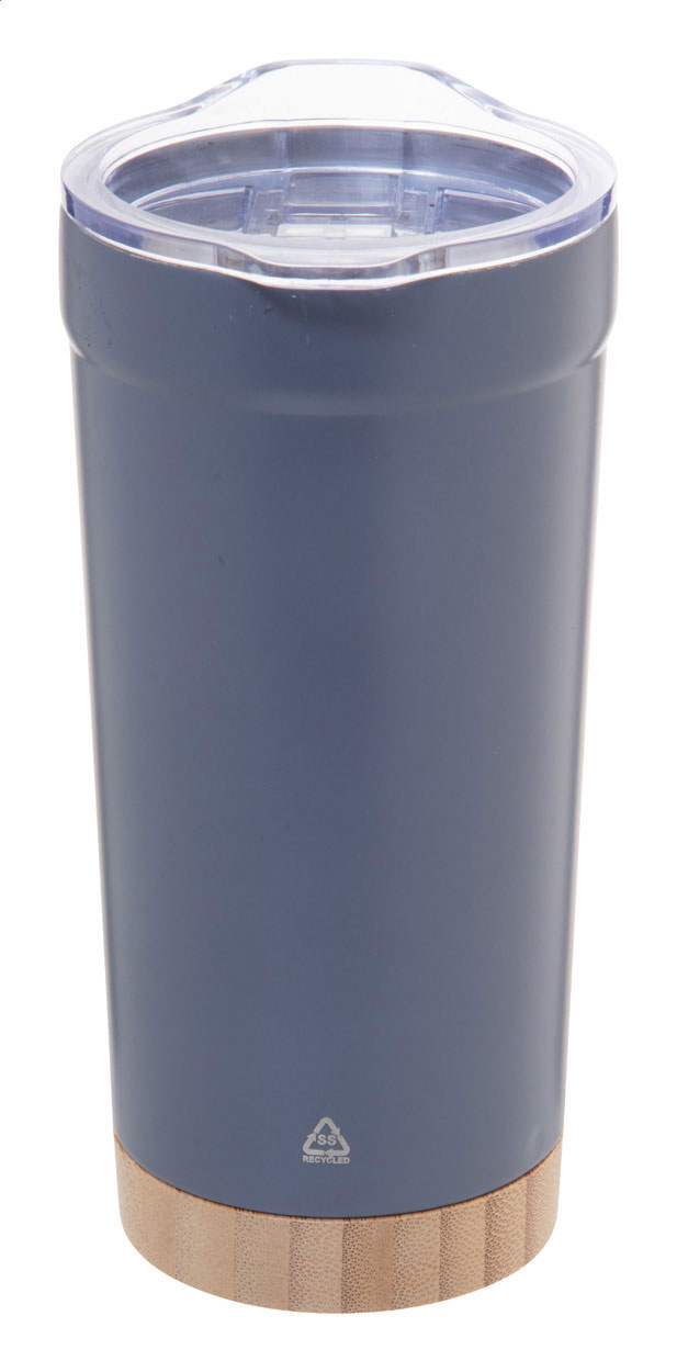• Dvoustěnný vakuově izolovaný termo hrnek z recyklované nerezové oceli s bambusovým dnem a AS plastovým víčkem na pití, 600 ml