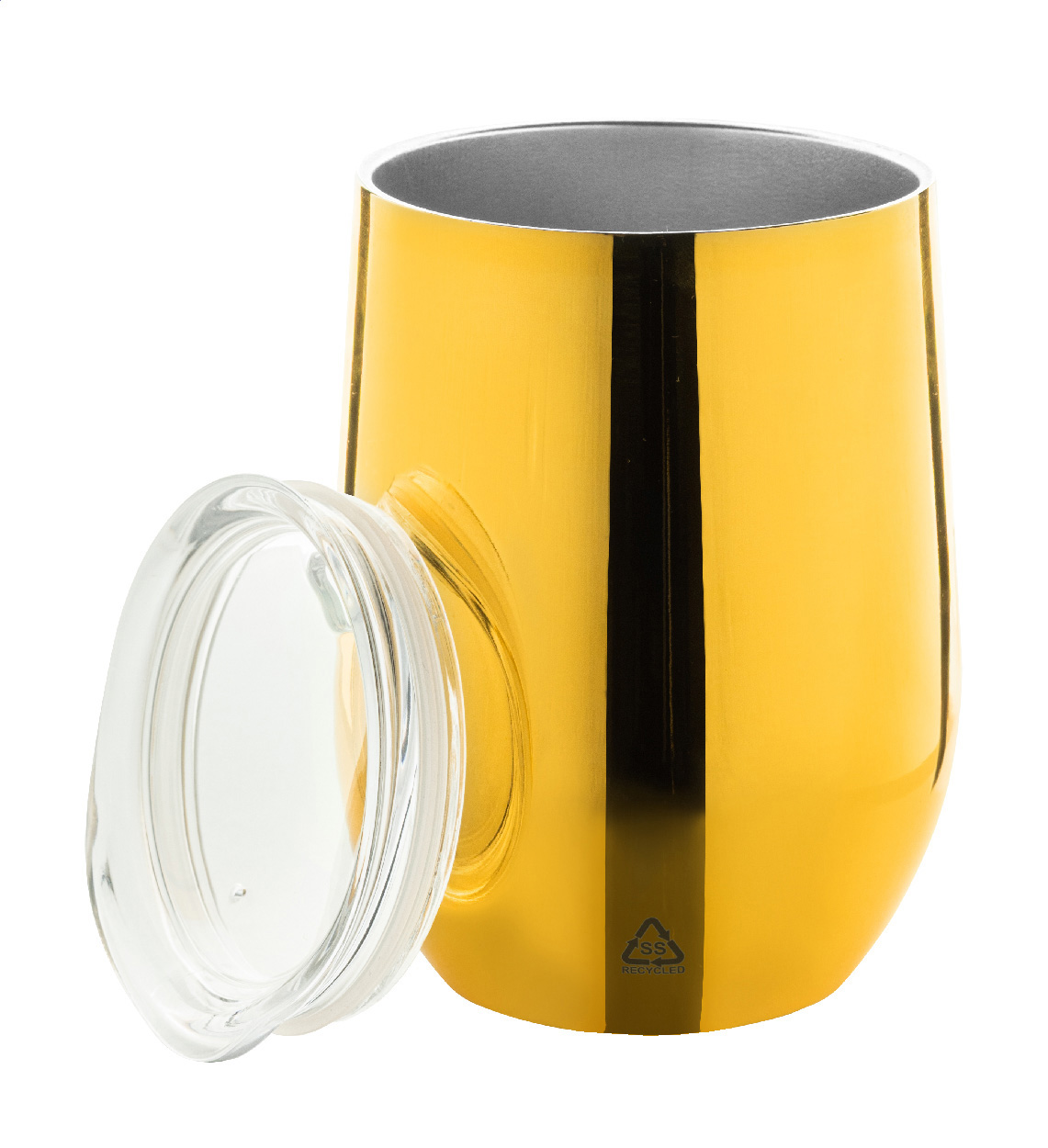 • Dvoustěnný termohrnek z recyklované nerezové oceli s vysoce lesklou kovovou povrchovou úpravou a plastovým víčkem, 350 ml.